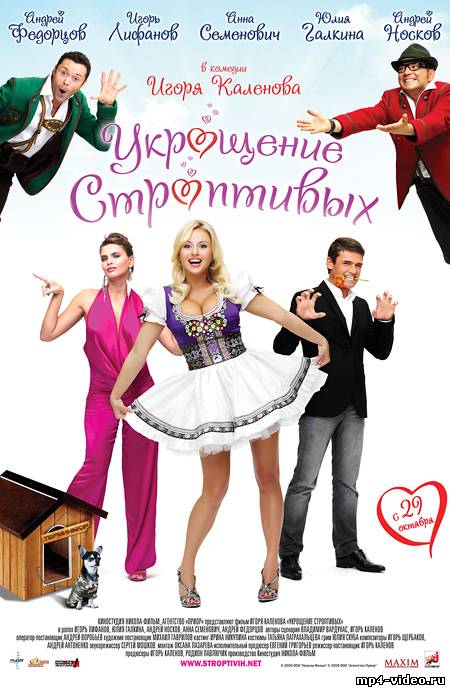 Название: Укрощение строптивых Производство: Россия Жанр: комедия Год выпуска: 2009, 90 мин. Режиссёр: Игорь Каленов В ролях: Анна Семенович, Игорь Лифанов, Юлия Галкина, Андрей Федорцов, Андрей Носков о фильме: Фотомодель Катя (Юлия Галкина), успешный бизнесмен «Мурзик» (Андрей Носков), блондинка Марина (Анна Семенович), её бойфренд Фёдор (Андрей Федорцов) и собачка Терминатор (чихуахуа Чарли) летят на отдых в Ниццу. Девушки совершенно уверены, что отправляются на французский курорт и сильно удивляются, узнав, что Ница – это таёжная река. Оказывается, мужчины решили подшутить над подругами.Мурзин и его напарник решают устроить своим подругам сюрприз. Организовав им отпуск в Ницце, возлюбленные во время полета меняют маршрут и приземляются в тайге, возле речки Ница. Вместо роскошного отдыха на Лазурном берегу Кате предстоит неделя в глуши на заимке "Медвежий угол". Но девушка не тихоня, которая будет молчать! Характер у Кати не простой , и она устраивает своему "Мурзику" образцовое выступление. Мурзин решает наказать строптивую подругу и ночью тайком уезжает на трехдневную рыбалку. Катя остается вдвоем с нелюдимым егерем Михалычем, который совсем не в восторге от гостей в принципе, и от Кати в частности. Городских ребят ожидает в лесу и на озере множество смешных приключений. Оказывается, что по сравнению с упрямством Михалыча вся вредность Кати - детские капризы, хотя борьба будет вестись с переменным успехом. Егерь окажется полон сюрпризов, и, когда измученный совестью Мурзин вернется за Катей, поймет, что ей не хочется уезжать. Длительность: 01:34:24 Качество: CAMRip Формат: mpeg4 Видео: 320x240 Рамзер: 182 Mb Размещено: deposit, letitbit скачать с letitbit скачать с depositfiles